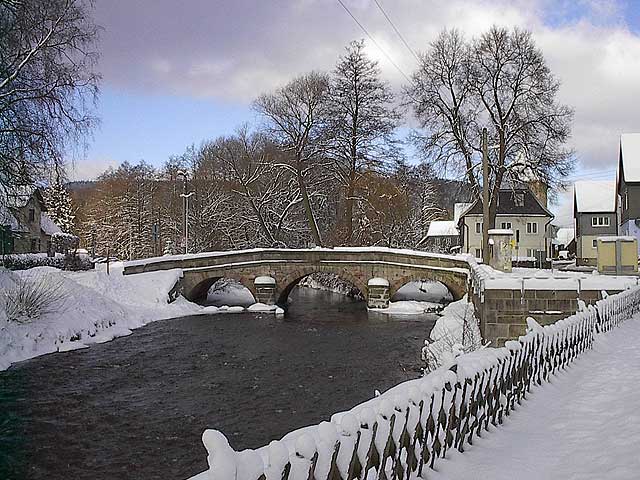 "Um nun diesem Übel einiger Maßen abzuhelfen, hatte die hiesige Gemeinde beschlossen, unter dem Hauptsteg steinerne Untersätze zu machen. Es ist auch wegen der Steine zu diesen Untersätzen mit dem Maurermeister Nicol Luther zu Neustadt an der Heide, welcher einen Steinbruch auf dem Muppberg, also ganz in der Nähe vom hiesigen Dorf besitzt, einen Vertrag dahin geschlossen worden, daß derselbe dazu die Mauersteine von seinem Bruche auf dem Muppberg und zwar in Quadratschuh liefern soll. Man hat aber der Gemeinde allhier geraten, anstatt des Hauptsteges mit steinernen Untersätzen, eine steinerne Brücke über den Landfluß zu erbauen. Es wurde gebeten von der Landesherrschaft um eine Bewilligung eines Brückenzolles, sowie einen Zuschuß von einem Drittel der Baukosten zu genehmigen. Dagegen sollte alljährlich das Drittel von dem Brückenzoll an das herzogliche, obervormundschaftliche, wohllöbliche Kastenamt zu Sonneberg gewährt werden."